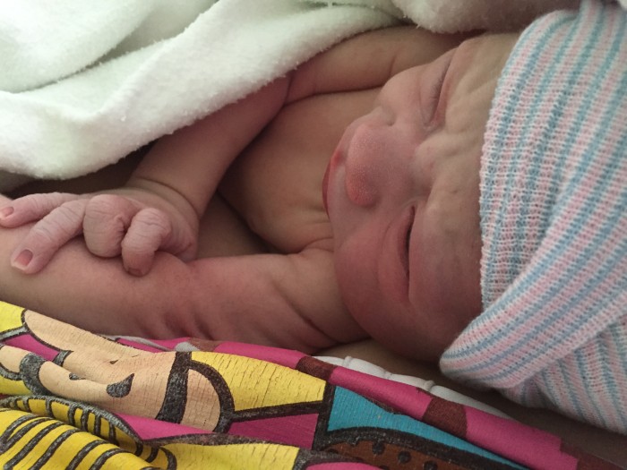 De ruggenprik zat erin en er werd gezegd dat we maar even moesten proberen te slapen. Het was mijn eerste kindje dus het zou nog lang kunnen duren voor het écht zover was. We probeerde een beetje rust te pakken en rond zeven uur werden we wakker gemaakt. Huib had nog wel even geslapen, ik lag vooral met mijn telefoon te spelen. Ik moest ontbijten (nou vooruit, één beschuitje dan…) en de nachtdienst werd afgewisseld door de dagdienst. De verloskundige die er overdag zou zijn, kwam binnen met een co-assistente. Ze zouden de bevalling samen gaan doen. Ze kwamen meteen even kijken hoe het ervoor stond (allebei ja…) Opeens had ik negen centimeter ontsluiting. Het ging hartstikke snel. Mijn moeder was er nog helemaal niet en die zou erbij zijn. Ik belde haar snel en ik was bang dat ze het alsnog zou missen. Ook dat had ik weer mis. Ze was ruim op tijd. Toen mijn moeder aan kwam, had ik inderdaad volledige ontsluiting, maar er gebeurde verder niets. Ik had geen persdrang. Tijdens de zwangerschapscursus hadden we wel besproken dat geen persdrang minder erg was dan persdrang krijgen als je nog geen volledige ontsluiting hebt, maar dat vond ik op dat moment niet zo heel interessant. Hallo dan, ik wilde nu wel een keer een baby zien. De verloskundige gaf me weeënopwekkers via het infuus was ze hadden aangelegd en de ruggenprik werd uit gezet. (Nee! Nee! Au!)